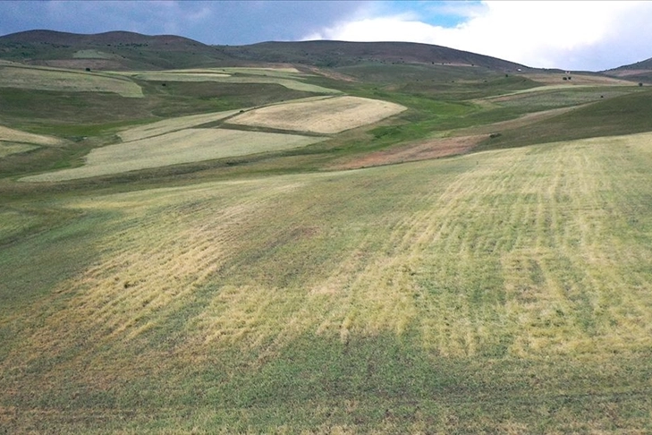 Dolunun zarar verdiği Aşağı Saklıca köyündeki arpa ve buğday tarlaları dronla görüntülendi.