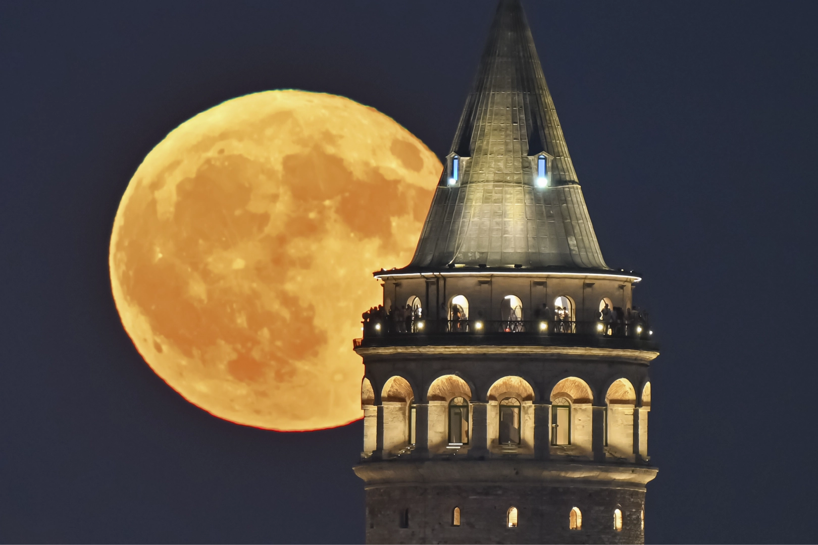 İstanbul semalarında yükselen dolunay, tarihi Galata Kulesi’nin eşsiz siluetiyle birlikte hızlandırılmış çekim tekniği kullanılarak görsel bir şölen oluşturdu.
