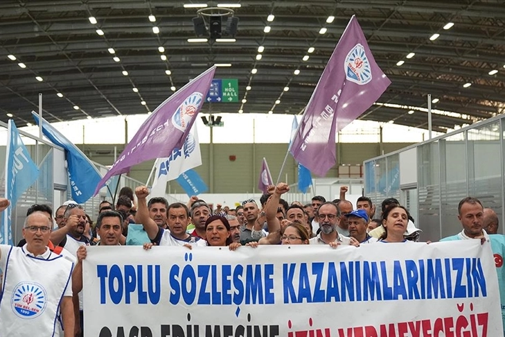 Kültürpark'taki 1 No'lu hol önünde bir araya gelen Yerel Yönetim Hizmetleri Emekçileri Sendikası (Tüm Bel-Sen) üyeleri, buradaki belediye hizmet binalarını dolaşarak slogan attı, halay çekti.
