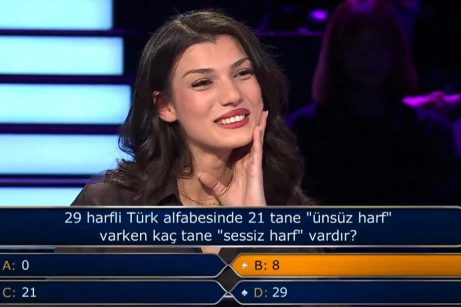 SORUNUN İÇİNDEKİ DOĞRU YANITI GÖREMEDİYarışmacının karşısına çıkan "29 harfli Türk alfabesinde 21 tane 'ünsüz harf' varken kaç tane 'sessiz harf' vardır?" sorusu, stüdyoda kısa süreli bir kararsızlığa neden oldu. Yarışmacı, yanıtından emin olamayınca "seyirci jokeri" hakkını kullanmayı tercih etti.