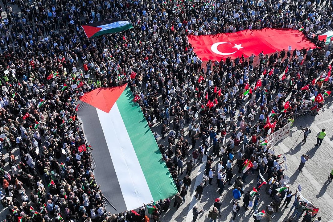 Vatandaşlar Türk ve Filistin bayrakları ile Kelime-i Tevhid flaması ve kefiye taşıdı, Filistin'in özgürlüğü için sloganlar attı.