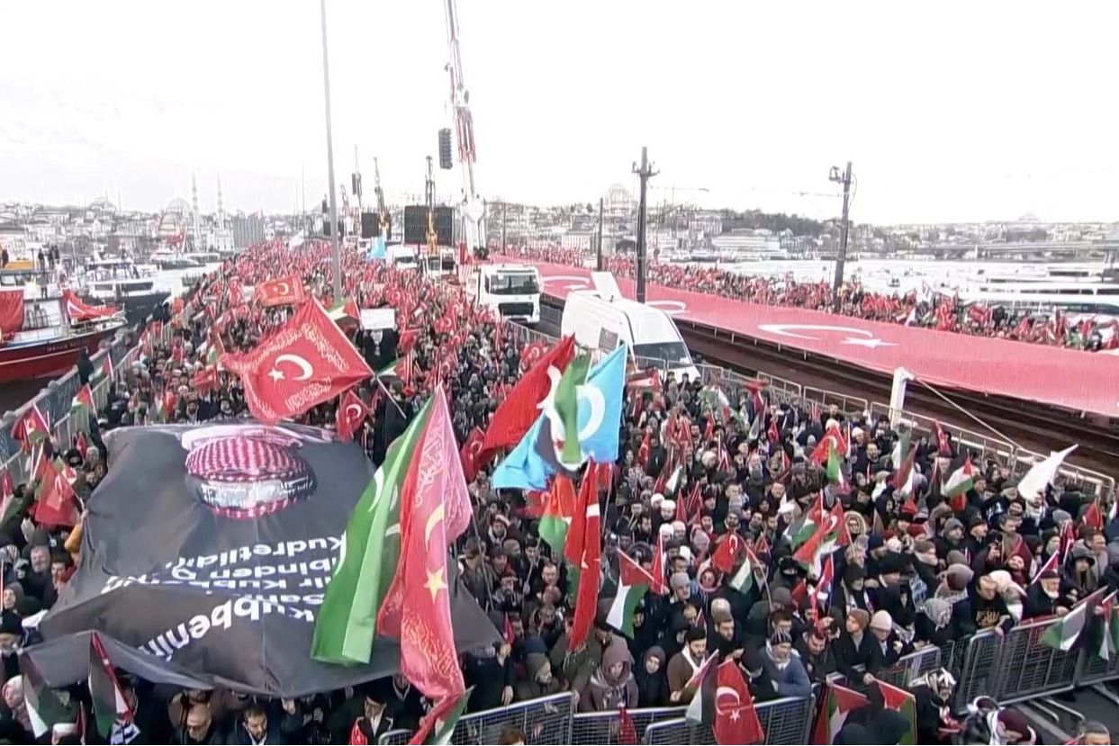 İstanbul’da düzenlenen “Sinmiyoruz, susmuyoruz, Filistin’i unutmuyoruz” etkinliği kapsamında vatandaşlar, camiler önünde bir araya gelerek Galata Köprüsü’ne yürüyüşe geçti. Etkinliğe bakanlar, milletvekilleri ve sivil toplum kuruluşları temsilcileri katıldı.