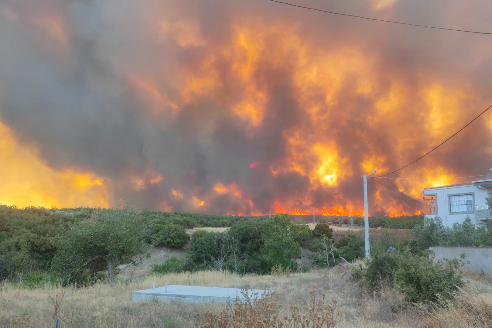 Yangından etkilenen bölgelerde bağlar ve zeytinlikler zarar görürken, vatandaşlar da hayvanlarını güvenli alanlara taşımaya çalışıyor.
