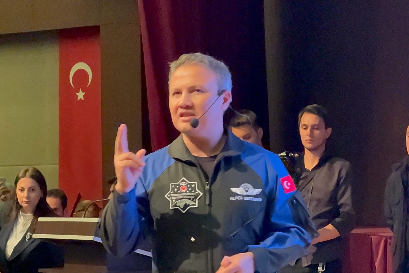 Alper Gezeravcı, astronotluğa başvuru süreci ve aldıkları eğitimler ile ilgili konuşmasını sürdürmesinin ardından gençlerle hatıra fotoğrafı çektirdi.