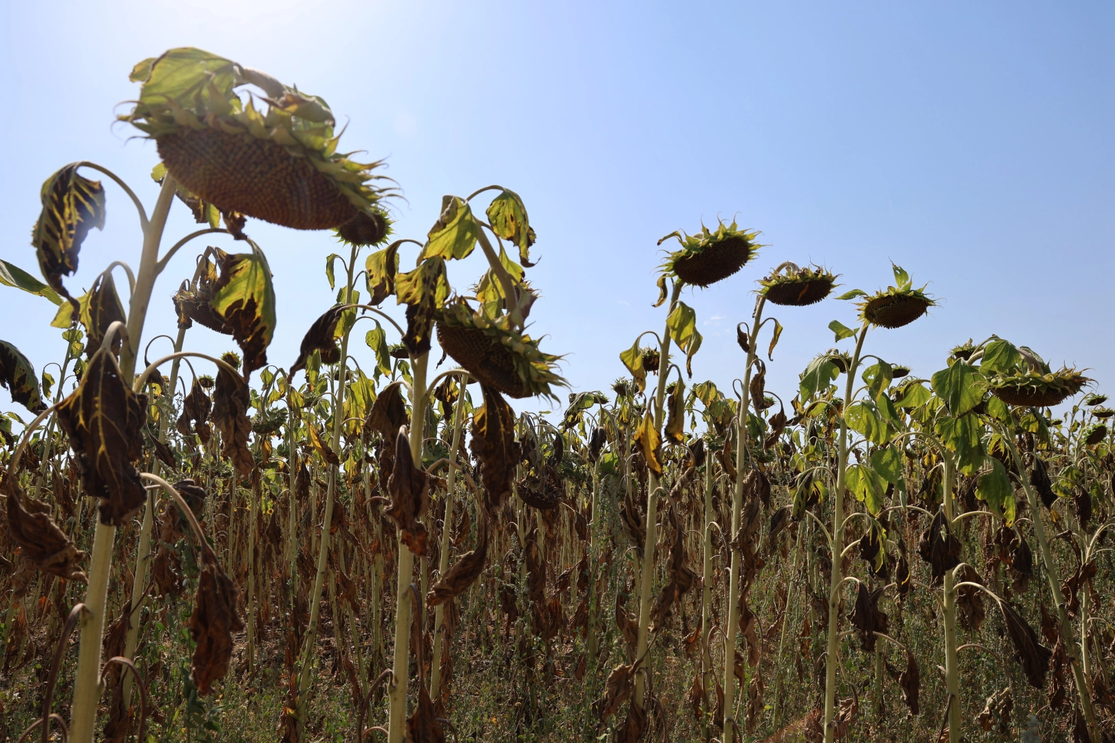 Tam olgunluğa ulaşamadan kuruma başlayan ayçiçek tarlalarındaki yarıklar kuralığı kuraklığı gözler önüne serdi. Aşırı sıcaklıkların etkili olduğu bölgede ayçiçek tarlalarındaki kuraklık manzarası havadan da görüntülendi.