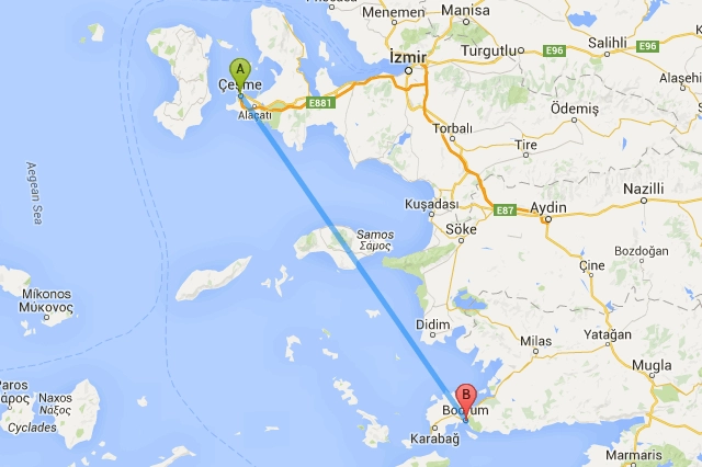 Bodrum'dan Çeşme'ye araba ile gitmek 197 kilometre ve 3 saat 44 dakika sürer.