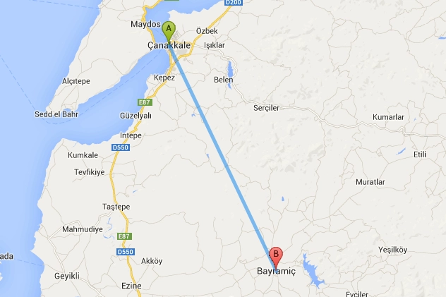 En kısa rota: Çanakkale - Ezine - Bayramiç (52 km, 48 dakika)