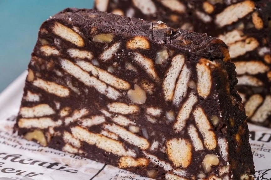 Servis: Buzdolabından çıkardığınız pastayı streç filmden çıkarın ve keskin bir bıçak yardımıyla dilimleyin. Dilerseniz dilimlerin bir yüzünü benmari usulü erittiğiniz çikolataya batırıp, üzerine fındık, ceviz veya Antep fıstığı serpiştirebilirsiniz.
