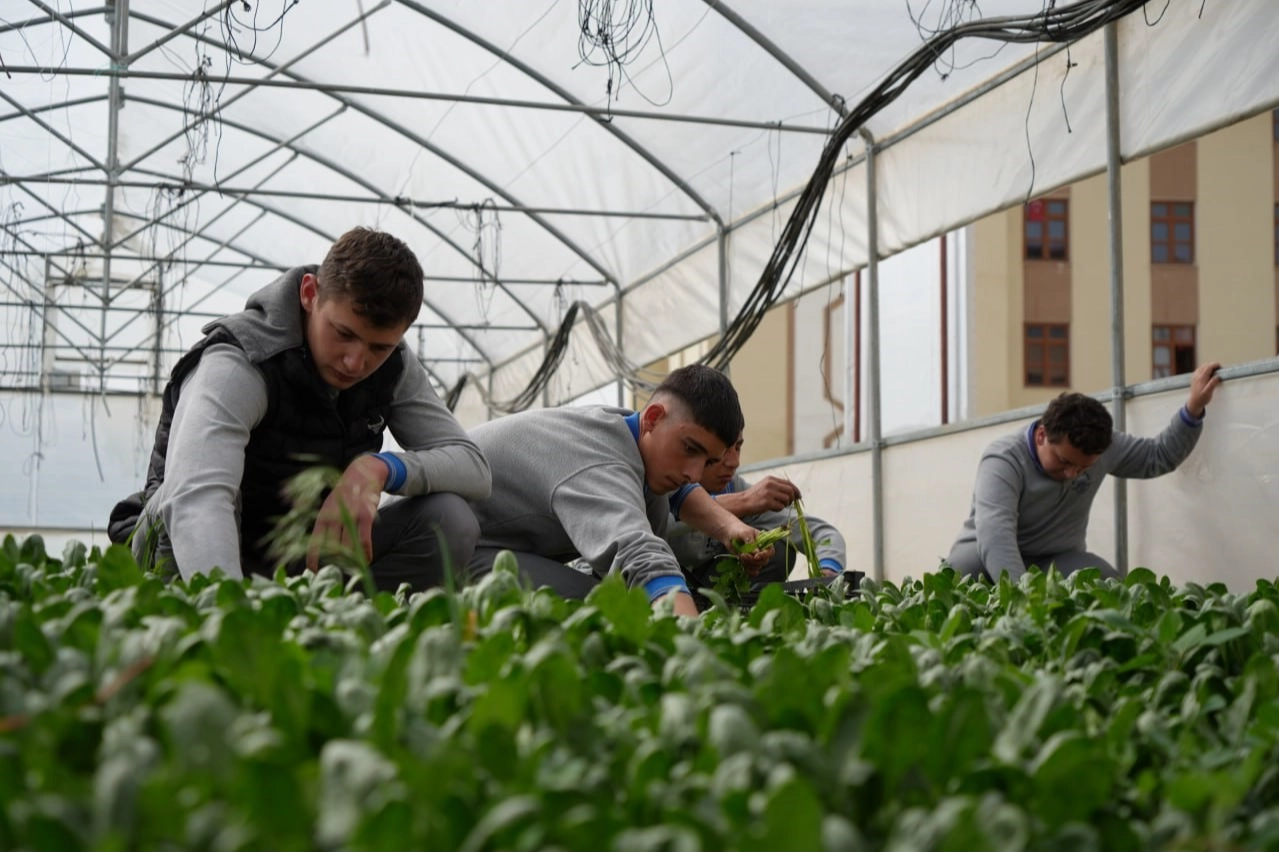 Öğrencilere üretimin kıymetini anlatabilmek için 'Hem Üretim, Hem Eğitim' sloganıyla yola çıktıklarını ifade eden Müdür Yardımcısı Arif Köprücü, "Bu serayı geçen sene Tarım İl Müdürlüğümüzün teşvikiyle yaptık. Geçen yıl tek mahsul almıştık, bu sene ilk olarak ıspanağımızı ektik, hasadını yaptık. Ispanak hasadından sonra domates, salatalık ve biberlerimizi ekeceğiz. Mevsim el verirse sezonu yeşil soğan, maydanoz gibi farklı sebzelerle tamamlamayı düşünüyoruz. 'Hem Üretim, Hem Eğitim' sloganıyla bu yola girdik, amacımız öğrencilerimize üretimin kıymetini, önemini anlatabilmekti. Bir taraftan da öğrencilerimize emeğin kolay olmadığını anlatarak, bu farkındalığı kazanmalarını amaçladık. Sebzeleri, meyveleri manavların tezgahlarında değil de böyle topraktayken görsünler istedik, manava gelinceye kadar hangi aşamalardan geçiyor, nasıl onlarca insan bu iş için emek veriyor buna şahit olsunlar istedik. Ispanak hasadımızı yaptık, şu an ıspanaklarımız yemekhanemize doğru yola çıktılar. İnşallah öğle yemeğinde de hep beraber yiyeceğiz" dedi.