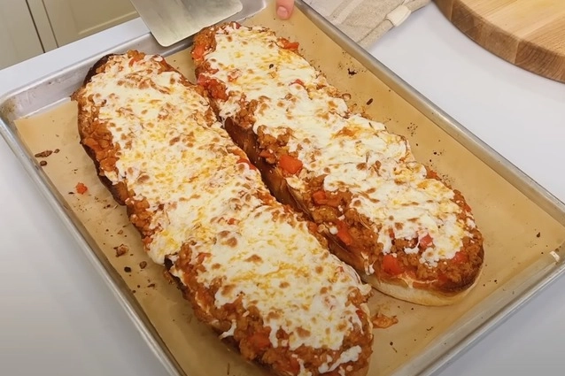 9.Kalan kaşar peynirlerini de ekmeklerin üzerine serpelim. Ardından fırına sürelim ve peynirler eriyene kadar pişirelim. 5 dakika sonra dilimleyerek servis edelim.