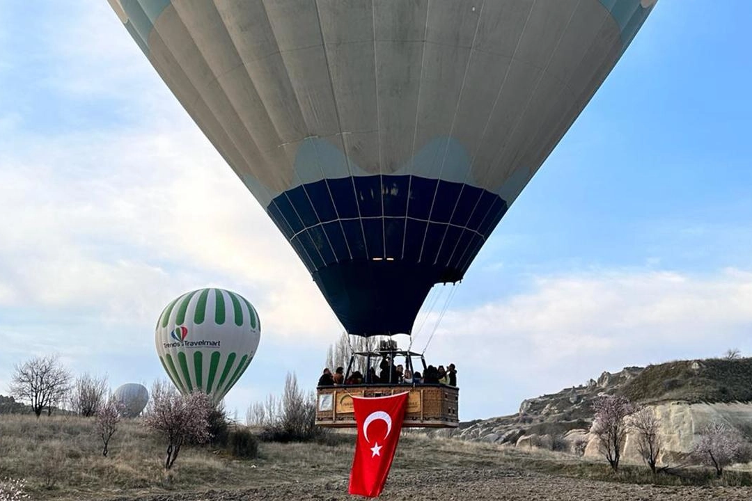 Turistlerin bindiği sıcak hava balonlarının bazılarının sepetlerine firma görevlilerince Türk bayrağı asıldı.