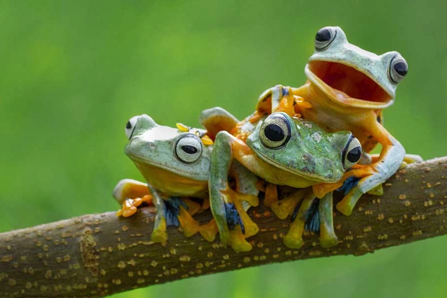 Uçan Kurbağalar: Evet, yanlış duymadınız! Güney Amerika'da yaşayan bazı kurbağa türleri, parmakları arasındaki geniş zarlar sayesinde ağaçtan ağaca süzülebilirler.