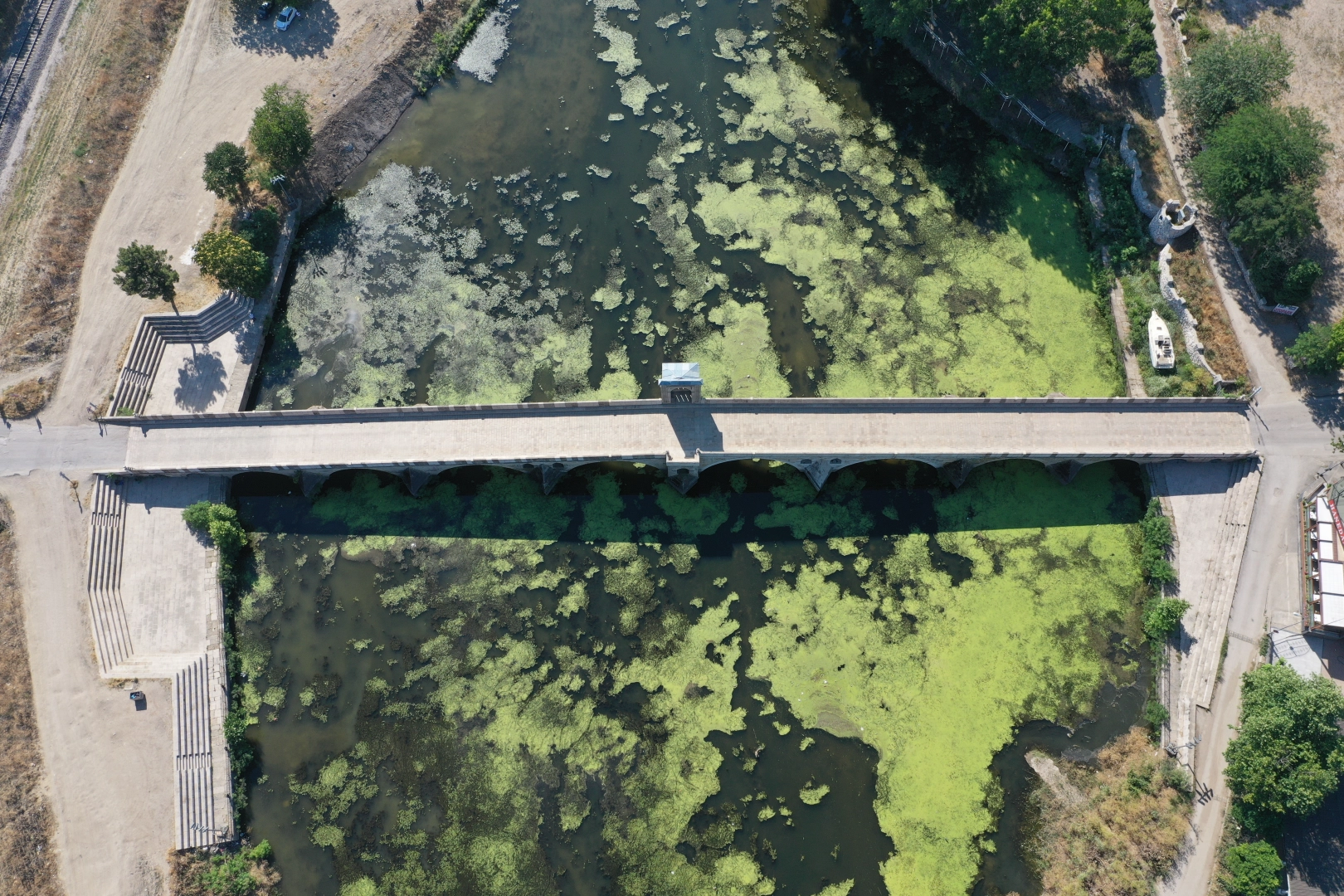 Sıcaklıkların da mevsim normalleri üzerinde seyretmesiyle nehrin yüzeyin bir büyük bir bölümünü yosun ve su mercimekleri kapladı.