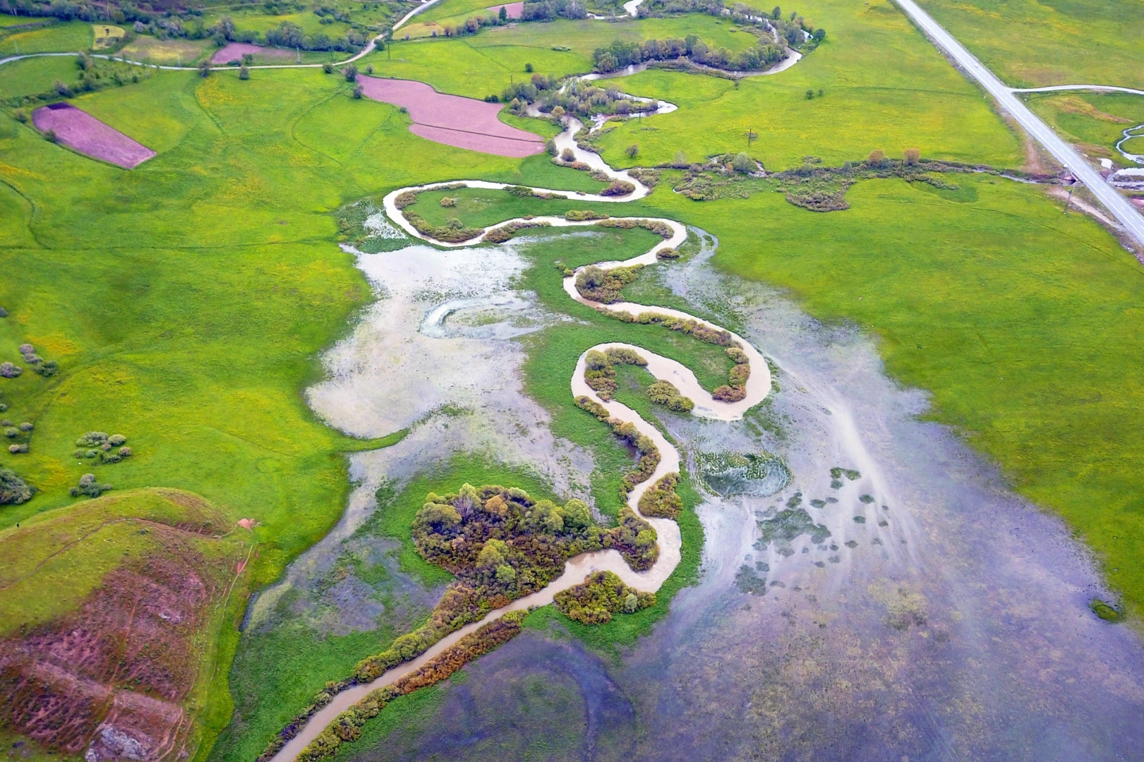Yağışlarla birlikte debisi yükselen mendereslerin kilometrelerce uzanan kıvrımlı yapısının oluşturduğu manzara havadan görüntülendi.