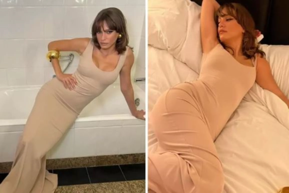 Kısa saçları ve zarif elbisesi ile geceye damgasını vuran güzel oyuncu, tüm dikkatleri üzerine çekti.