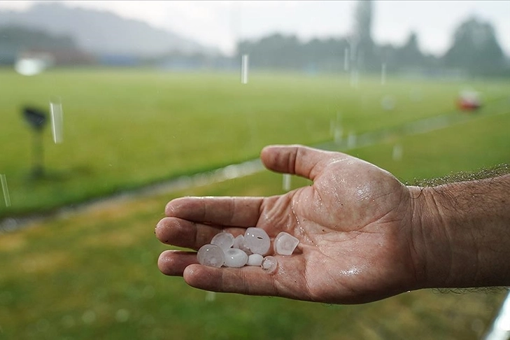 Saha zemininde yağmur sularının birikmesiyle top sürmenin zorlaştığı dikkati çekti.