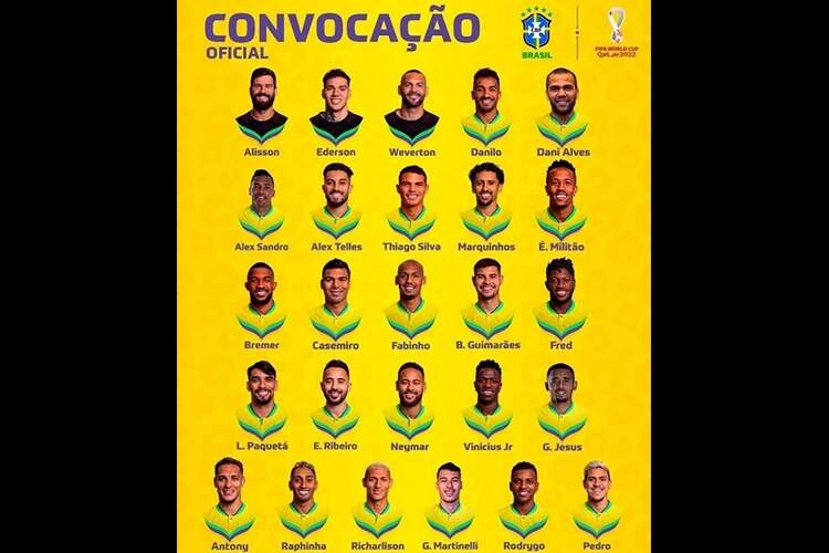 Katar’ın ev sahipliği yapacağı 2022 Dünya Kupası’na sayılı günler kala ülkeler turnuvaya katılacağı kadroları açıklamaya başladı. 5 kez Dünya Kupası'nı kazanarak bu alanda zirvede olan Güney Amerika ülkesinin yıldızlarla dolu kadrosu dikkat çekiyor. Teknik Direktör Tite, 26 kişilik kadroya şu isimleri dahil etti: Kaleciler: Alisson, Ederson, Weverton Defens: Thiago Silva, Marquinhos, Eder Militao, Bremer Kanatlar: Danilo, Dani Alves, Alex Sandro, Alex Telles Orta sahalar: Casemiro, Fabinho, B.Guimaraes, Fred, Lucas Paqueta, Everton Ribeiro Forvetler: Neymar, Vinicius Jr., Gabriel Jesus, Antony, Raphinha, Richarlison, Gabriel Martinelli, Rodrygo, Pedro.