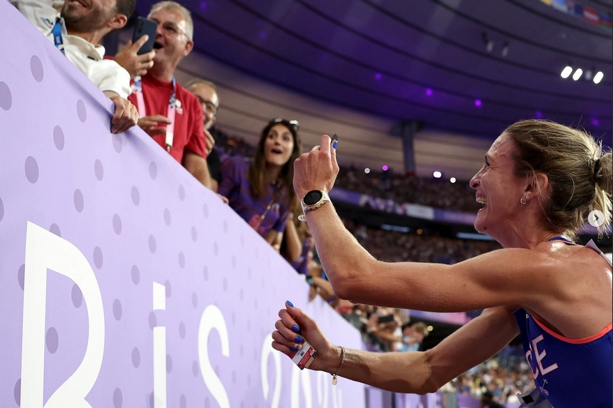 Erkek arkadaşının bulunduğu alana giden Fransız atlet yanında taşıdığı yüzüğü diz çöküp ona uzatarak evlilik teklifinde bulundu.