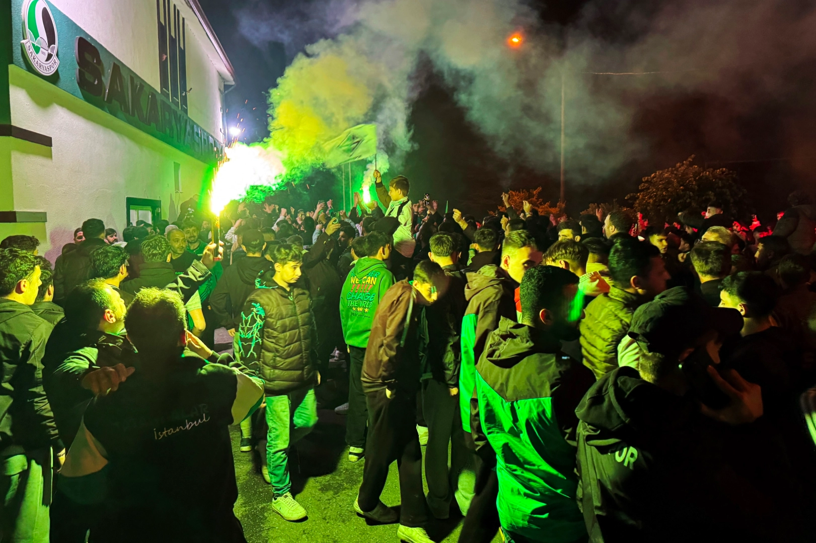 Burada da yakılan meşaleler eşliğinde tezahüratlar yapan taraftarlara, Sakaryaspor Kulüp Başkanı Cumhur Genç ‘üçlü’ çektirdi.