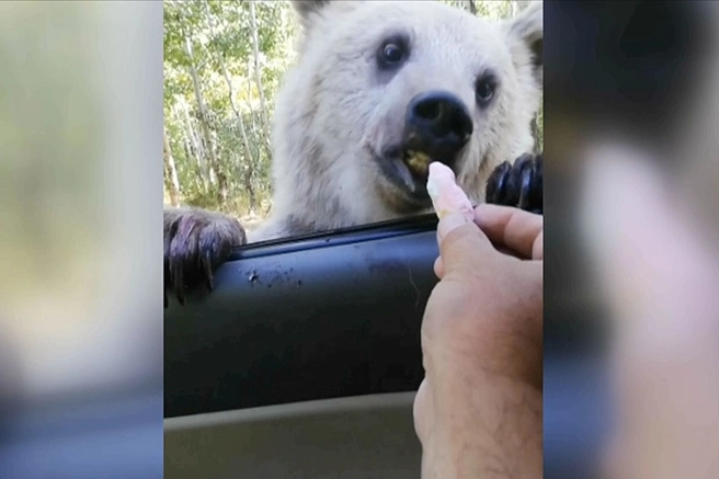 Bitlisli vatandaşlardan Asım Araboğa da Nemrut Krater Gölü'ne giderken aracına yaklaşan bozayıya şeker yedirdi.