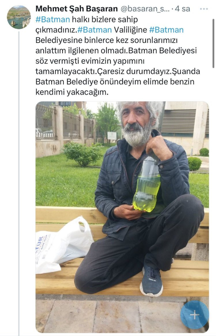 Başaran sosyal medya hesabından “Batman halkı bizlere sahip çıkmadınız. Batman Valiliğine, Batman Belediyesine binlerce kez sorunlarımızı anlattım ilgilenen olmadı. Batman Belediyesi söz vermişti evimizin yapımını tamamlayacaktı. Çaresiz durumdayız. Şuanda Batman Belediyesi önündeyim kendimi yakacağım. Üzerime benzin dökmeye çalıştım. Batman Belediye Başkanlığı güvenlik görevlileri bana müdahale etti, küfür ve hakarette bulundu. Bana bir şey olursa Batman Belediye Başkanlığı yetkilileri sorumludur” diye paylaşımda bulundu.