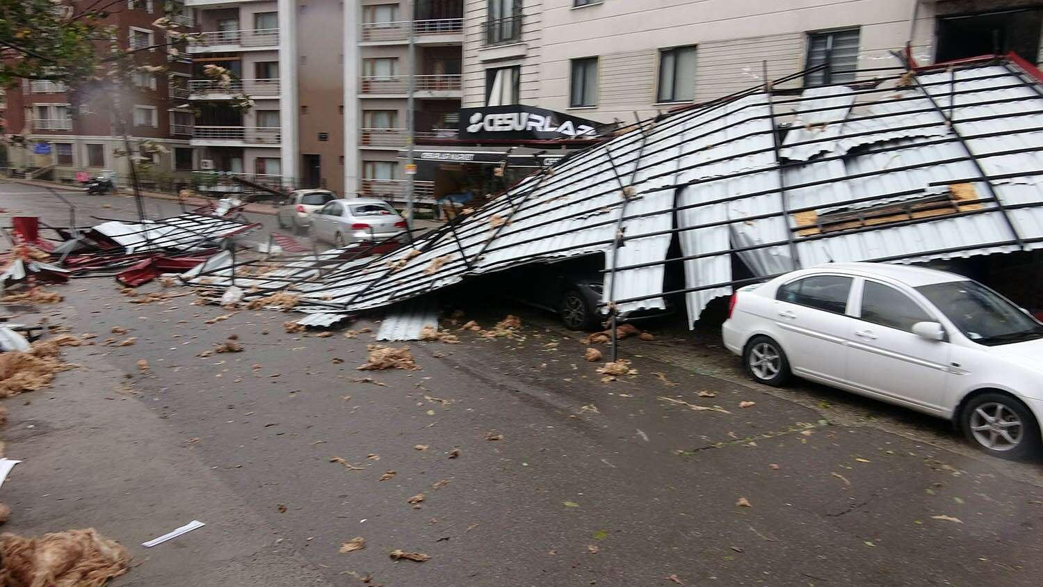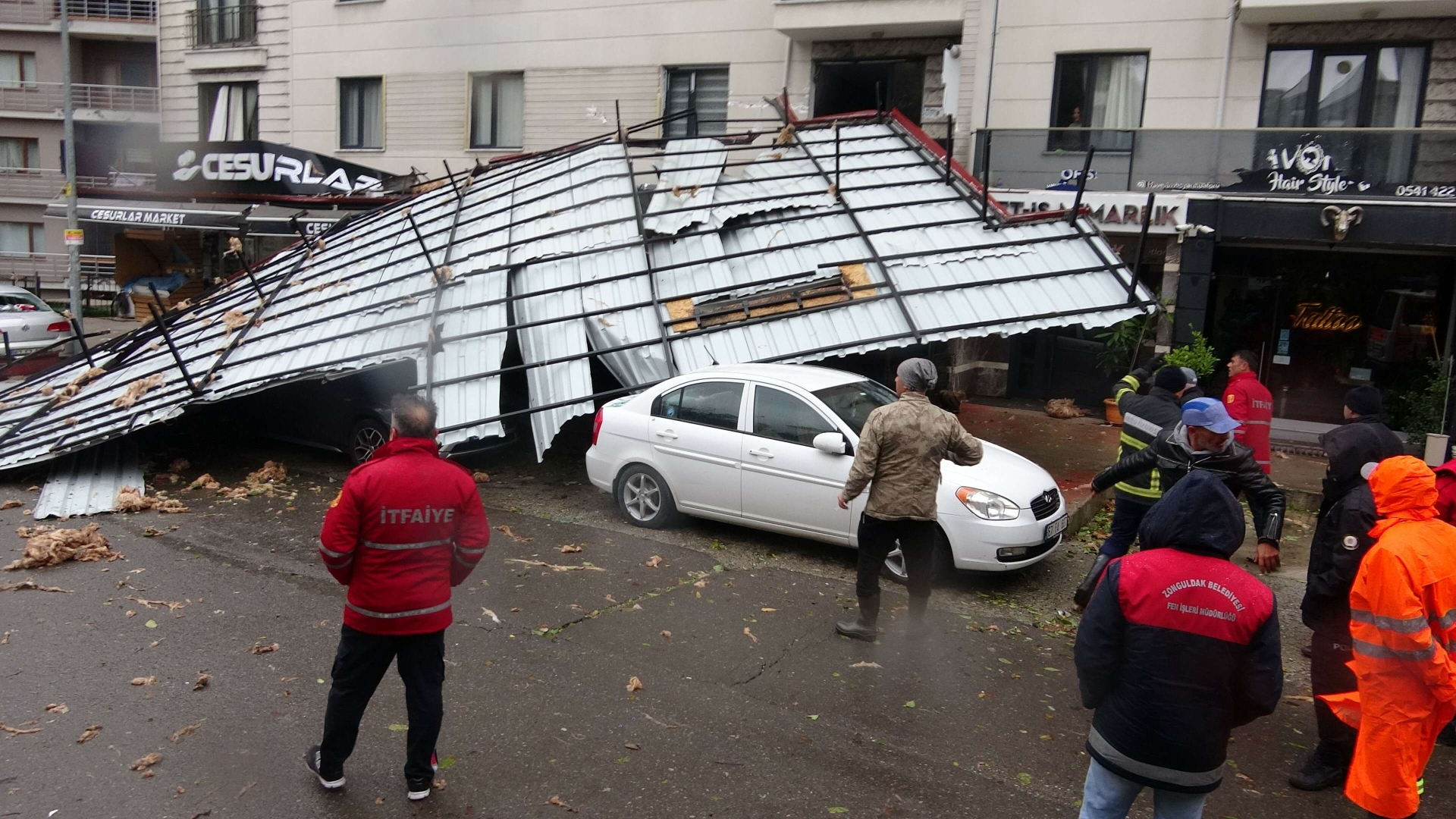 Zonguldak'ta etkili olan fırtına nedeniyle bazı evlerin çatıları uçarken, kopan parçalarda park halindeki araçlara zarar verdi.