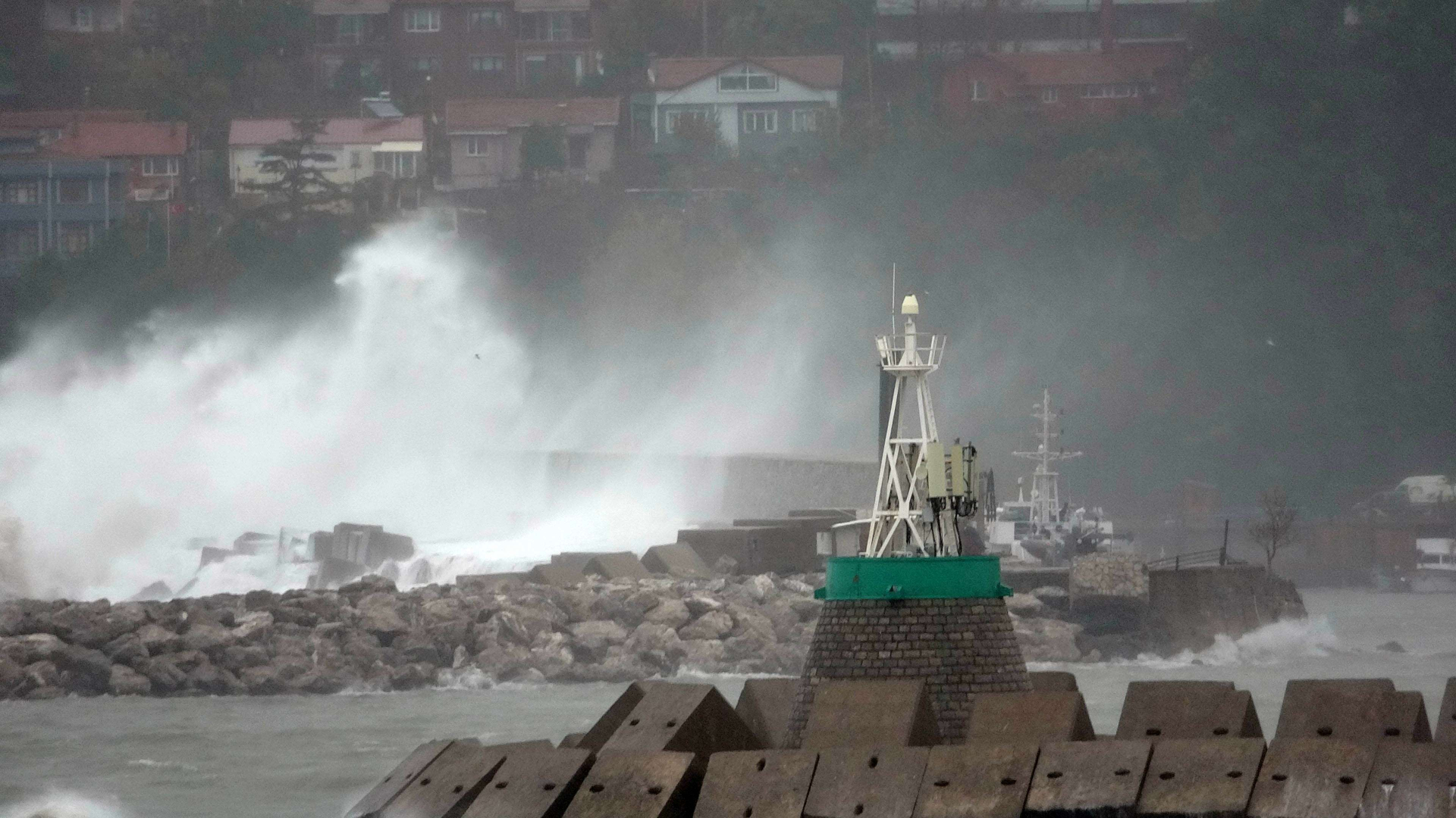 Öte yandan, fırtına ve yağmur sebebiyle sahilde boyu 7 metreyi aşan dev dalgalar oluştu. Bazı dalgalar 7 metrelik duvarı aşarak limana girdi.