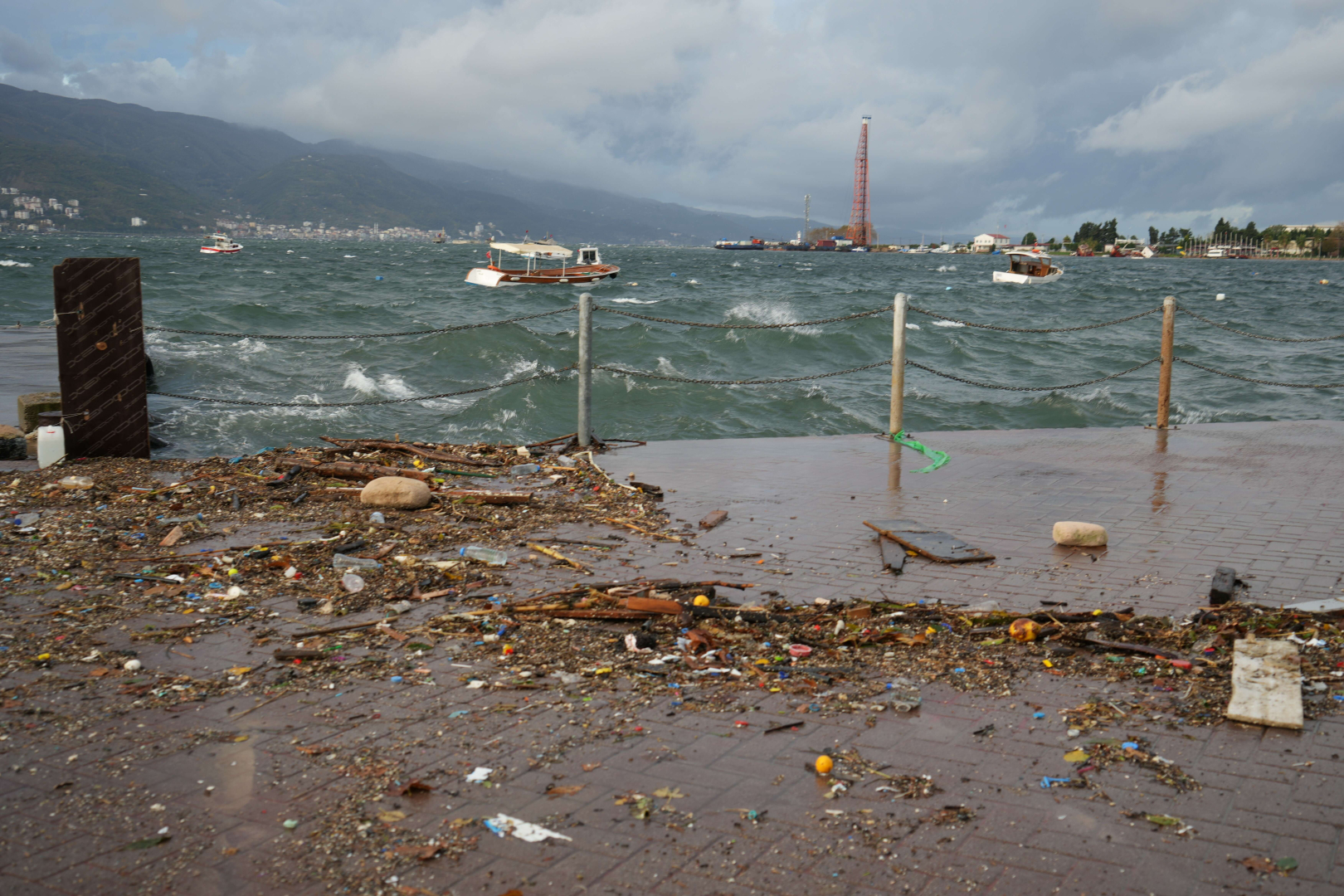 Etkili olan rüzgarda sahil boyu çöple doldu, bir lunaparkın ise tentesi söküldü.