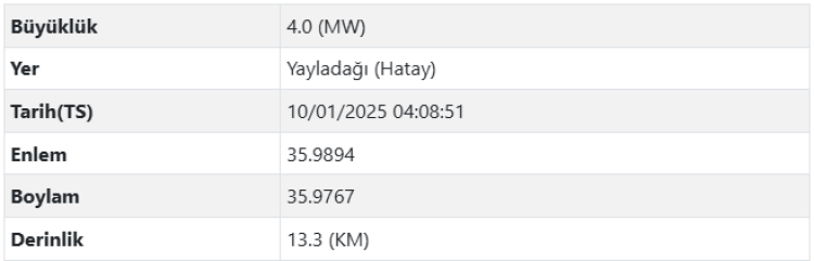 Afet ve Acil Durum Yönetimi Başkanlığı (AFAD), bugün saat 07.08'de Hatay'ın Yayladağı ilçesinde 4 büyüklüğünde bir deprem kaydedildiğini açıkladı.