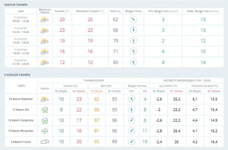 10 Kasım Pazartesi: Parçalı bulutlu bir hava etkili olacak. Sıcaklıklar 10°C ile 23°C arasında değişecek.