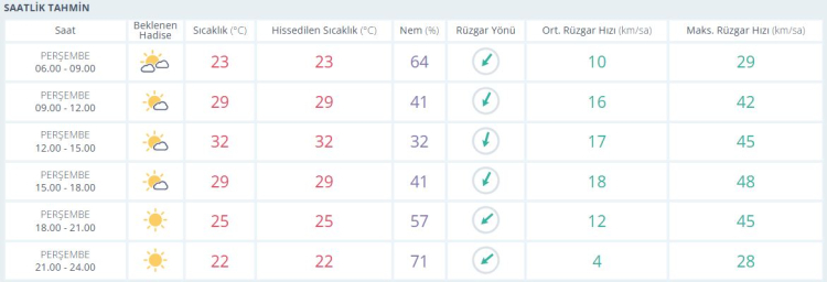 09.00’dan itibaren bulutlar azalıyor ve hava açılıyor. 12.00’ye kadar sıcaklık 29°C’ye kadar çıkıyor. Günün en sıcak saatleri olan 12.00 - 15.00 arasında termometreler 32°C’yi gösterecek. Hissedilen sıcaklık da aynı seviyede olacak. Nem oranı bu saatlerde yüzde 32’ye kadar düşerken, rüzgar gücünü artırıyor: Ortalama 17 km/s, maksimum 45 km/s rüzgarlar bekleniyor.
