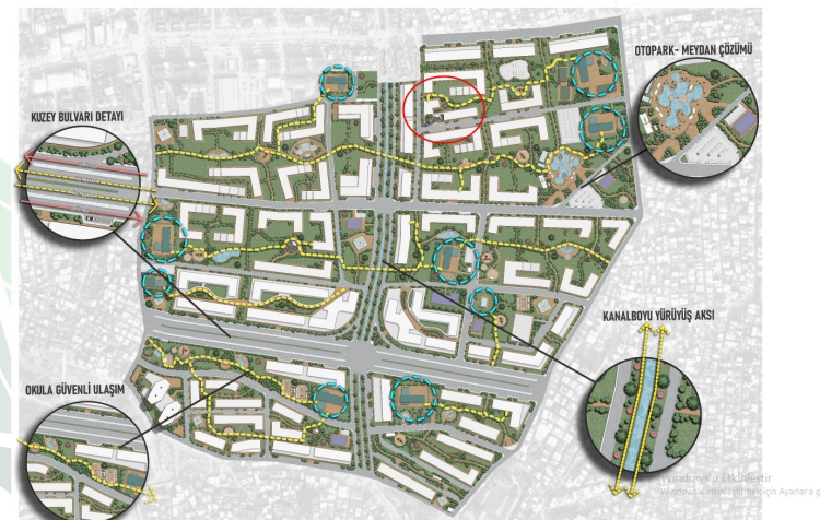 Parklar, sosyal donatı alanları ve eğitim yapıları kesintisiz yaya akslarıyla birbirine bağlanacak. Böylece çocuklar ve yaşlılar, araç trafiğinden uzak güvenli yollarla günlük ihtiyaçlarına ulaşabilecek.
