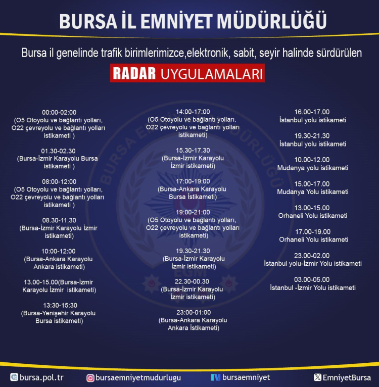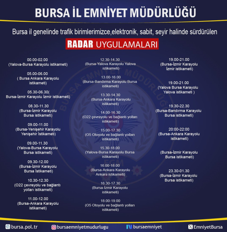 Bursa İl Emniyet Müdürlüğü, trafikte can ve mal güvenliğini sağlamak amacıyla hız ihlallerine yönelik denetimlerini sürdürüyor. Bu kapsamda gerçekleştirilen radar kontrollerine dair bilgiler, resmi sosyal medya hesapları üzerinden düzenli olarak kamuoyuyla paylaşılıyor. Yapılan son duyuruda ise radar uygulamalarının hangi gün, saat ve güzergâhlarda yapılacağına ilişkin ayrıntılı bilgilendirme yapıldı.