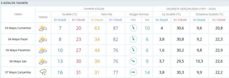 7 Mayıs Çarşamba günü gök gürültülü sağanak yağış bekleniyor. Sıcaklıklar yine yüksek seyrederek 16–31°C arasında olacak. Rüzgar hızı ise 14 km/sa seviyelerine çıkabilir. Hafta ortasında kısa süreli yağış geçişleri görülecek.