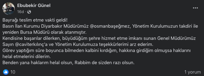 Günel paylaşımında, bir önceki dönemde yaklaşık Bursa'da 4,5 yıl görev alan Osman Başeğmez'in yeniden Basın İlan Kurumu Bursa Şube Müdürü olarak atandığını belirtti.