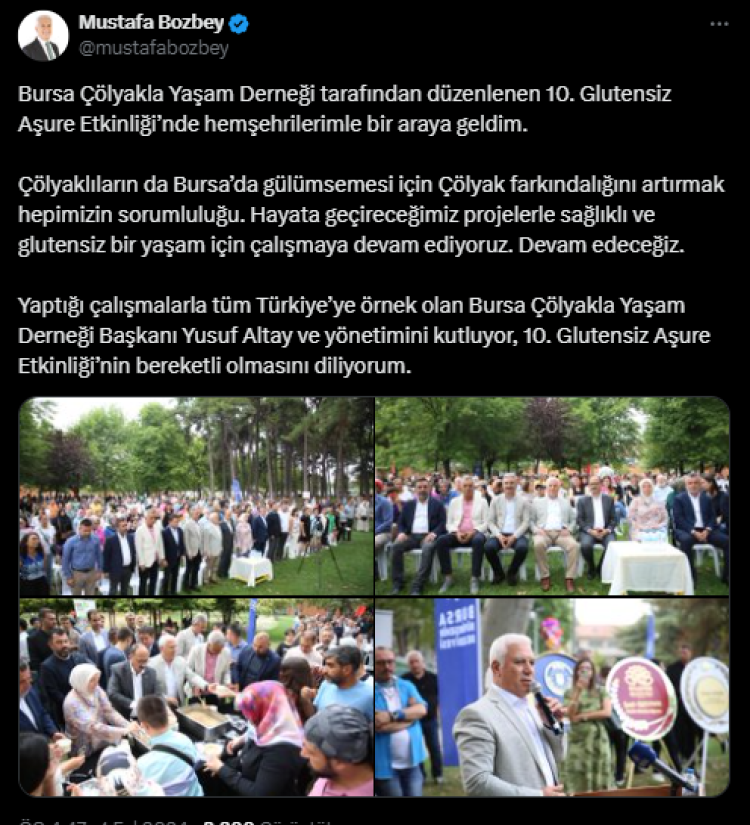 Bursa Büyükşehir Belediye Başkanı Mustafa Bozbey, Bursa Çölyakla Yaşam Derneği tarafından düzenlenen 10. Glutensiz Aşure Etkinliği’nde hemşehrileriyle bir araya geldi.