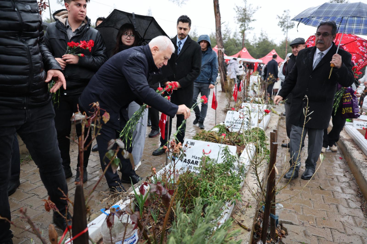 Depremde yakınlarını kaybeden ailelerle bir araya gelen heyet, Kur’an-ı Kerim tilaveti ve dualar eşliğinde mezarlara karanfil bıraktı.