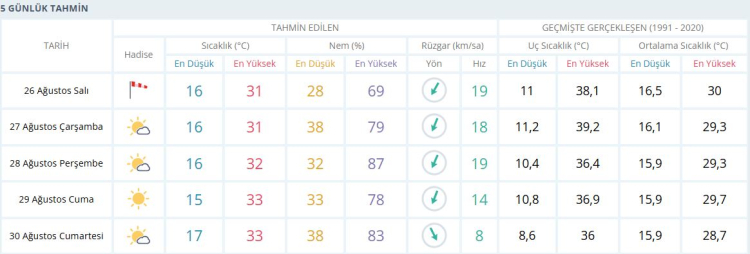 27 Ağustos Çarşamba günü az bulutlu bir gökyüzü bekleniyor. Sıcaklıklar 16 ila 31 derece arasında seyredecek. Nem oranı yüzde 38 ile 79 arasında. Rüzgar 18 km/saat hızında olacak. Uzun yıllar ortalamasına göre bu günlerde sıcaklık genellikle 29 derece civarında oluyor.