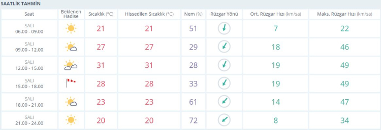 Günün ilerleyen saatlerinde hava sıcaklığı hızla yükseldi. Saat 12.00 ile 15.00 arasında parçalı bulutlu bir gökyüzü eşliğinde sıcaklık 31°C’ye ulaştı. Bu saatlerde nem oranı yüzde 28 gibi düşük seviyelerde kalırken, rüzgarın etkisi hissedilmeye devam etti.