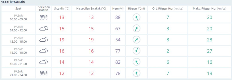 06.00 – 09.00: Puslu hava etkili olacak. Sıcaklık 13°C, nem oranı %88. Rüzgar hızı 20 km/sa.