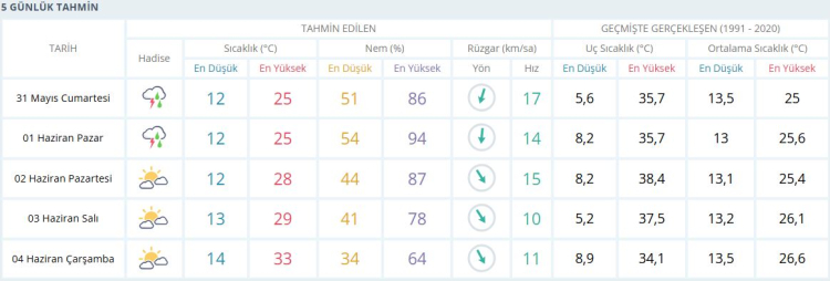 Bursa’da 31 Mayıs Cumartesi ve 1 Haziran Pazar günleri gök gürültülü sağanak yağışlara karşı dikkatli olunmalı. Ancak 2 Haziran’dan itibaren hava açılıyor, sıcaklıklar hızla yükseliyor. Özellikle Çarşamba günü 33 dereceye ulaşan sıcaklıkla yaz mevsimi etkisini hissettirecek. Açık hava etkinlikleri için Pazartesi sonrası günler daha uygun görünüyor.