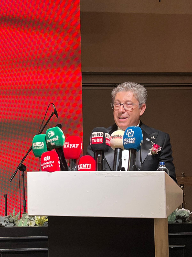 “Bursa iş insanları derneği gibi yerler tabip odalarından bile önce bir araya gelmişlerdir mimar ve mühendisler. Mimarlar ve mühendisler 15. asırdan beri varlık göstermektedir. Bursa’da büyük bir beylerbeyidir. Türkiye’nin önemli iş ve devlet adamları vardır. Onları değerlendirmemiz gerekiyor. Birbirinden meşhur mimarlar olduğu gibi mühendisler ve tüccarlarda vardır. Buradan 101 yılllarını kutluyorum ve bana bu ödülü verdikleri için onur duyuyorum. Cumhuriyet Bayramı dolayısıyla program yoğun geçiyor. Antalya’da arkeolog ve müzeci arkadaşları ziyaret ettim.