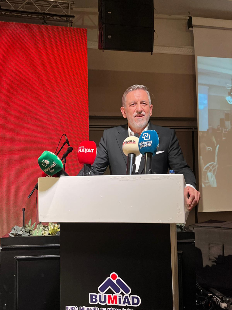 Ödül töreninde konuşma yapan BTSO Başkanı İbrahim Burkay, “Cumhuriyetimizin 101. yılını kutladığımız bu güzel günlerde böyle bir etkinlikle sizlerle birlikte olmaktan dolayı da büyük bir memnuniyet duyduğumu ifade etmek istiyorum. Aslında İlber Hocamız Bursa'mızı çok güzel tarif etti. Hem de kalkınmışlıkla gelişmişlik arasında oluşan farkı kapatmanın da nasıl mümkün olduğunu bu akşam bize güzel bir şekilde anlattı. Burada özellikle toplum içinde bulunduğu ekosistemin dönüştürme arzusunda olan toplumun aydın, hiçbir zaman yılgınlık göstermemesi ve bu anlamda da mücadele etmesinin ne kadar önemli olduğunu vurguladı. Tabii bugünlere ulaşmamızda ve bir asır yaşında ama genç bir cumhuriyetin kurucusu başta Gazi Mustafa Kemal Atatürk olmak üzere tüm silah arkadaşlarını rahmetle, minnetle anıyorum. Ve umut ediyorum ki Bursa gibi şehirlerin sayısı arttıkça ülkemizin önümüzde daha çok uzun yılların bilincinde olarak çalışmaya devam edeceğiz diyorum” şeklinde konuştu.