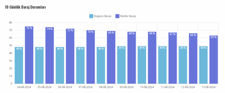 Bursa'nın 10 günlük baraj doluluk oranlarına bakıldığında, 4 Ağustos'ta yüzde 75 oranında bulunan Nilüfer Barajı, 13 Ağustos'ta yüzde 63 oranına düşüyor. Doğancı Barajı'nda aynı tarihler aralığında doluluk oranı yüzde 48'den yüzde 49'a yükseldiği görülüyor.