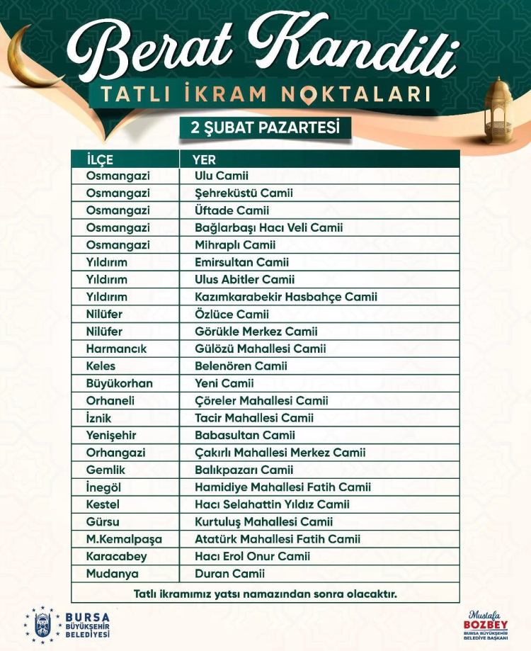 Yıldırım ilçesinde ise Emirsultan Camii, Ulu Abitler Camii ve Kazımkarabekir Hasbahçe Camii’nde kandil tatlısı dağıtımı yapılacak. Nilüfer ilçesinde Özlüce Camii ile Görükle Merkez Camii ikram noktaları olarak belirlendi.