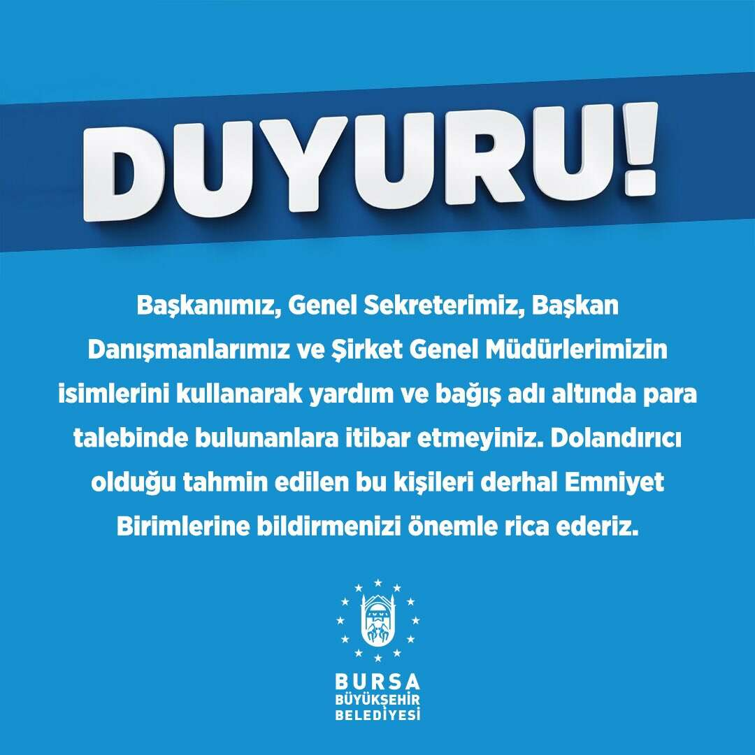 Bursa Büyükşehir Belediyesi, Başkan Alinur Aktaş, Genel Sekreter, Başkan Danışmanları ve şirket genel müdürlerinin isimlerini kullanarak yardım ve bağış adı altında para talebinde bulunanlara itibar edilmemesi gerektiği konusunda uyardı. Dolandırıcı olduğu tahmin edilen bu kişilerin derhal emniyet birimlerine bildirilmesi gerekiyor.