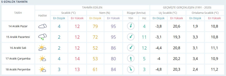 1991–2020 yılları arasındaki meteorolojik verilerle karşılaştırıldığında, 14 Aralık Pazar günü beklenen sıcaklık değerlerinin mevsim normallerine yakın olduğu görülüyor. Günün en düşük sıcaklığının 4 derece, en yüksek sıcaklığının ise 12 derece civarında olması bekleniyor.