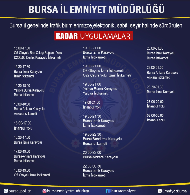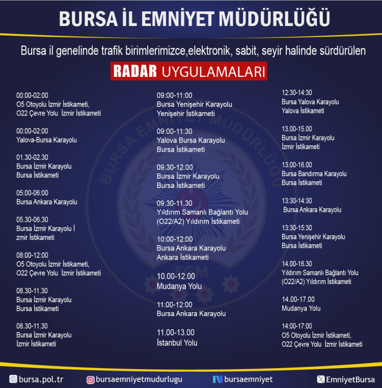 Bursa İl Emniyet Müdürlüğü, 17 Kasım 2025 Pazartesi günü kent genelinde uygulanacak radar denetim noktalarını ve saatlerini açıkladı. Sürücüler hız limitlerine uymaları konusunda uyarıldı.