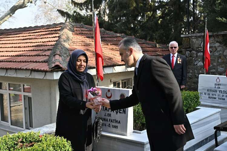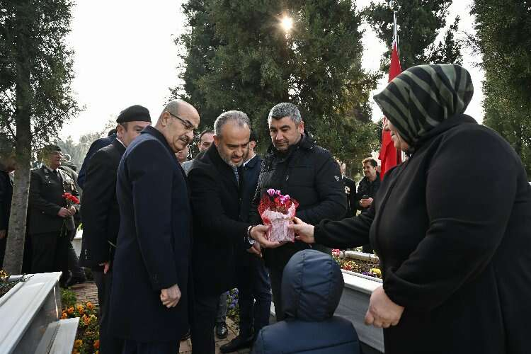 Bursa Büyükşehir Belediye Başkanı Alinur Aktaş, Vali Mahmut Demirtaş ile birlikte şehit mezarlıklarına karanfil bırakarak, şehit ailelerine çiçek takdiminde bulundu.