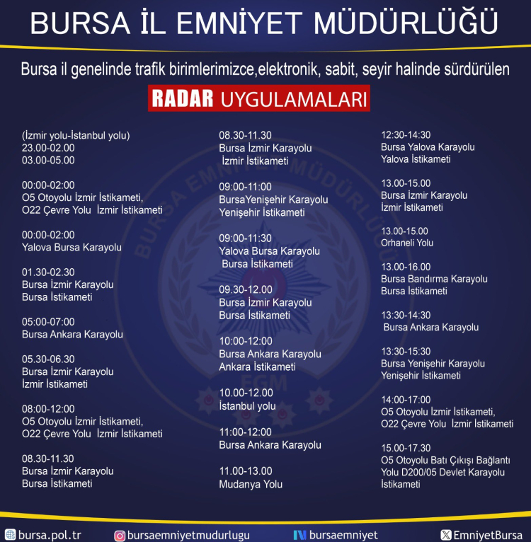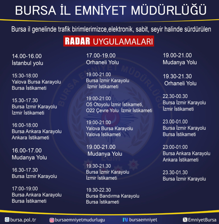 Bursa Emniyet Müdürlüğü’nden yapılan açıklamada, “İlimiz genelinde gerçekleştirilen elektronik, sabit ve seyir halindeki radar uygulamaları kapsamında, hız ihlallerine ilişkin planlanan denetimlere dair bilgilendirmeler aşağıdaki gibidir” denilerek gün boyu yapılacak uygulamaların güzergah ve saat bilgileri detaylandırıldı.